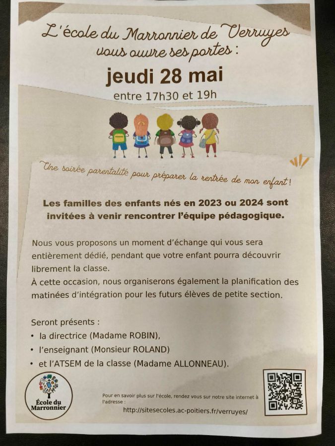 Votre enfant est né en 2023 ou 2024 ? Venez rencontrer l'équipe enseignante et visiter l'école de Verruyes le 28 mai !