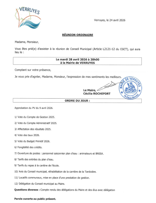 Le Conseil municipal se réunira le mardi 28 avril 2026 à 20 heures en mairie pour une session ordinaire ouverte au public.